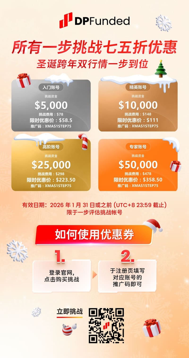 您好,为配合年末冲刺及新年拉新转化,DPFunded 将于 12 月推出 圣诞 & 新年限时促销活动。本次活动覆盖两步挑战及一步挑战,适合不同类型客户重点推广,大家可以积极宣传。