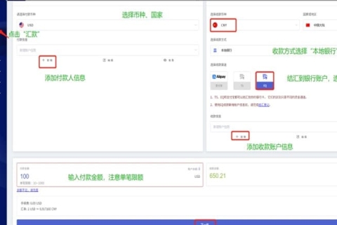 登录 Epay 账户后 :1)点击首页【汇款】/左侧列表【汇款】→ 单笔汇款,即可跳转到下单页面2)选择付款币种、收款币种 → 选择收款方式:国内银行 → 选择收款渠道:EQ,添加收付款账户信息→ 输入付款金额,点击下 ...