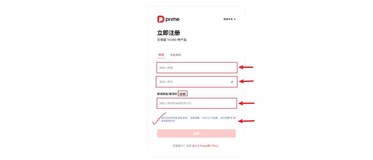 打开D Prime官方网站,在登录页面,输入您的电子邮箱地址/手机号和密码,然后点击【登录】按钮登陆用户中心。