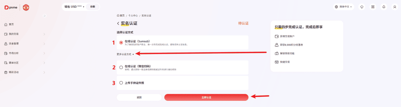 2.5 实名认证。来到【实名认证】的页面,你会默认看到只有一个认证方式 - 【在线认证(Sumsub)】。您可以点击【更多认证方式】,来选择其他两个认证方式: