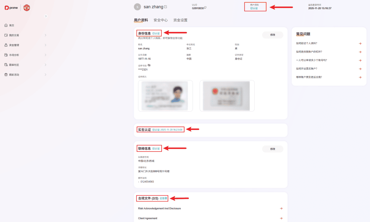 l 待审核通过之后,您会看到【用户资料】【身份信息】【实名认证】【联络信息】以及【合规文件】 的右边会显示【已认证】。