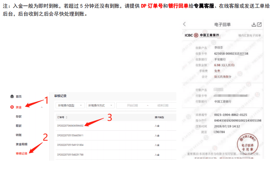A.登陆到用户中心B.在首页点击1“资金”2“存款”3 找到并点击C.在“存款账户”4 选择需要入金的账户,支付币种 默认CNYD.在“存款金额”5 填写需要入金的金额,注意不同OTC平台存在不同的限额,限额是 110 – 1,300 ...